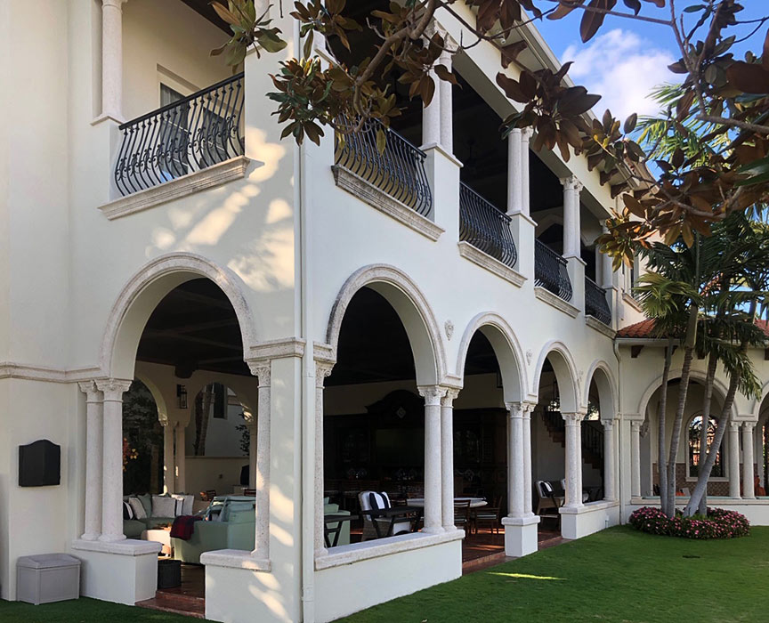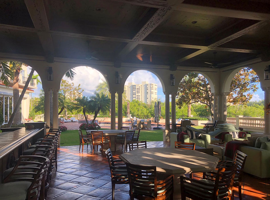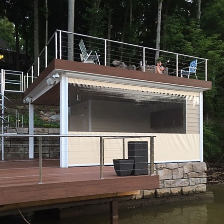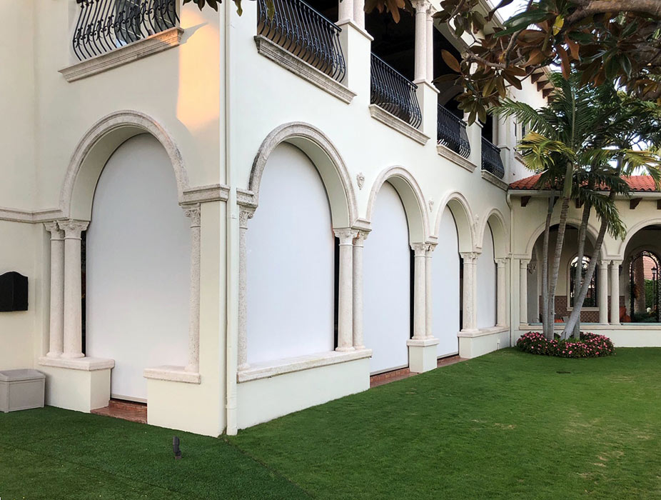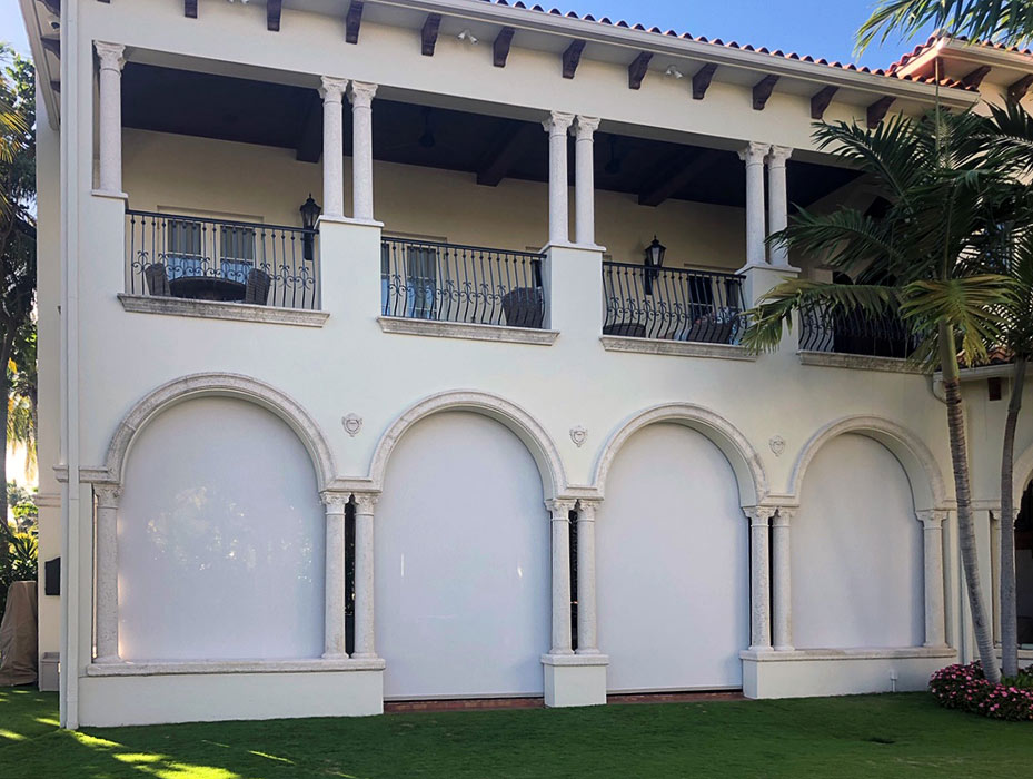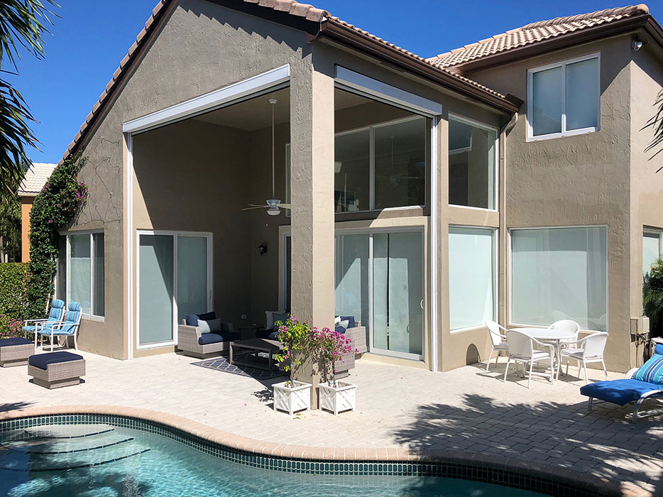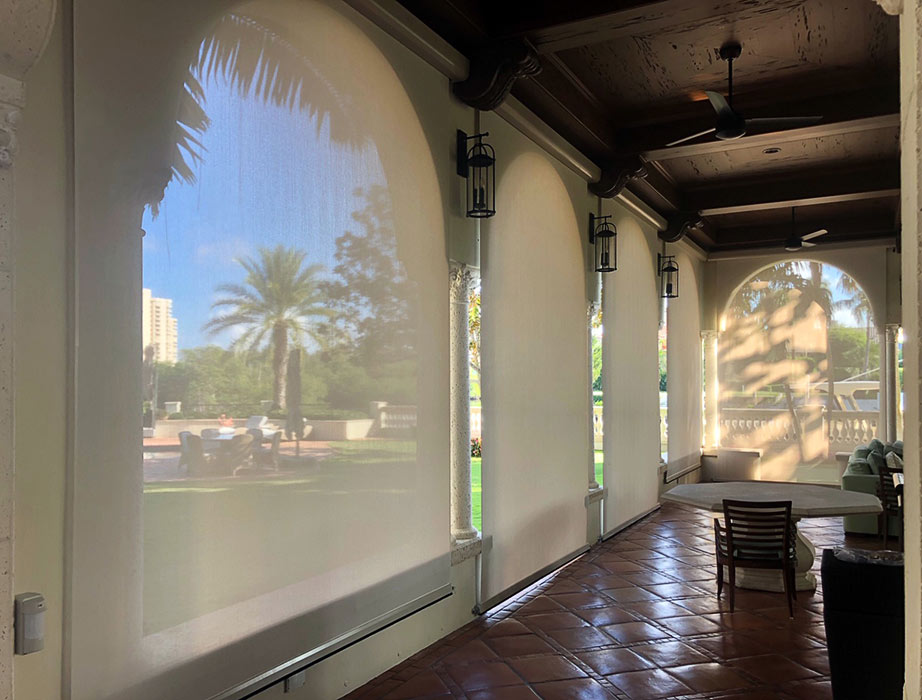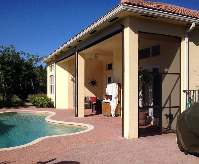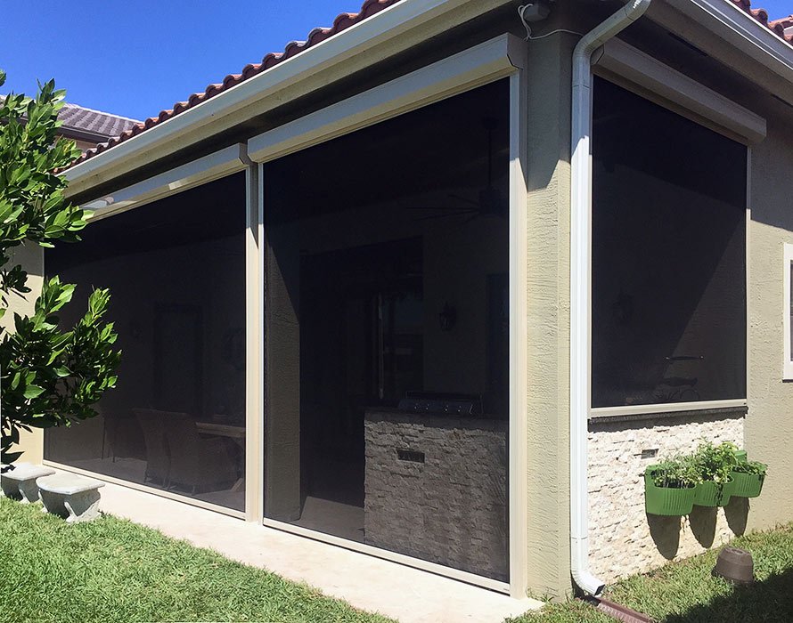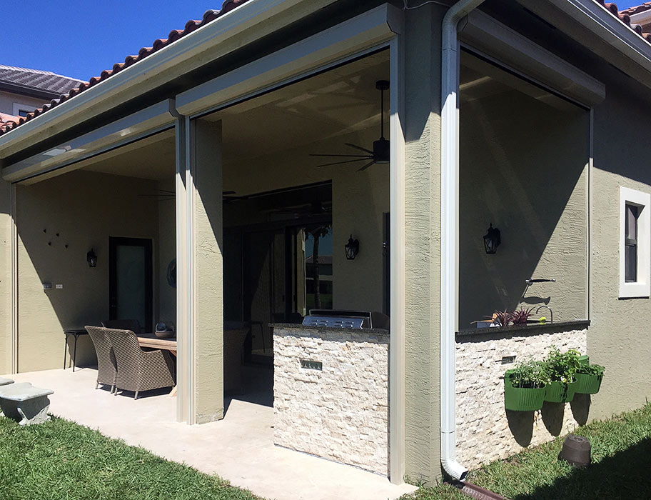 The screens (or clear vinyl curtains) are retracted into housings mounted above the opening that both protect the screen and keep it clean. A sturdy weight bar keeps downward tension on the screen, while sidetracks keep the screen tight across its width.