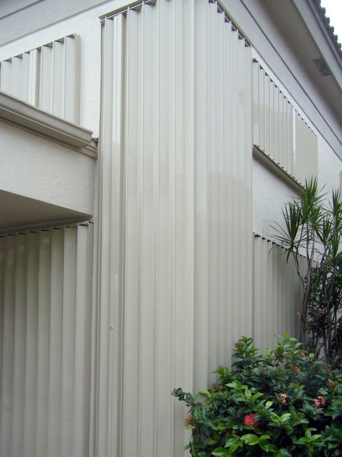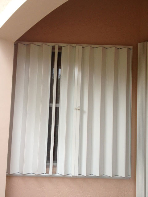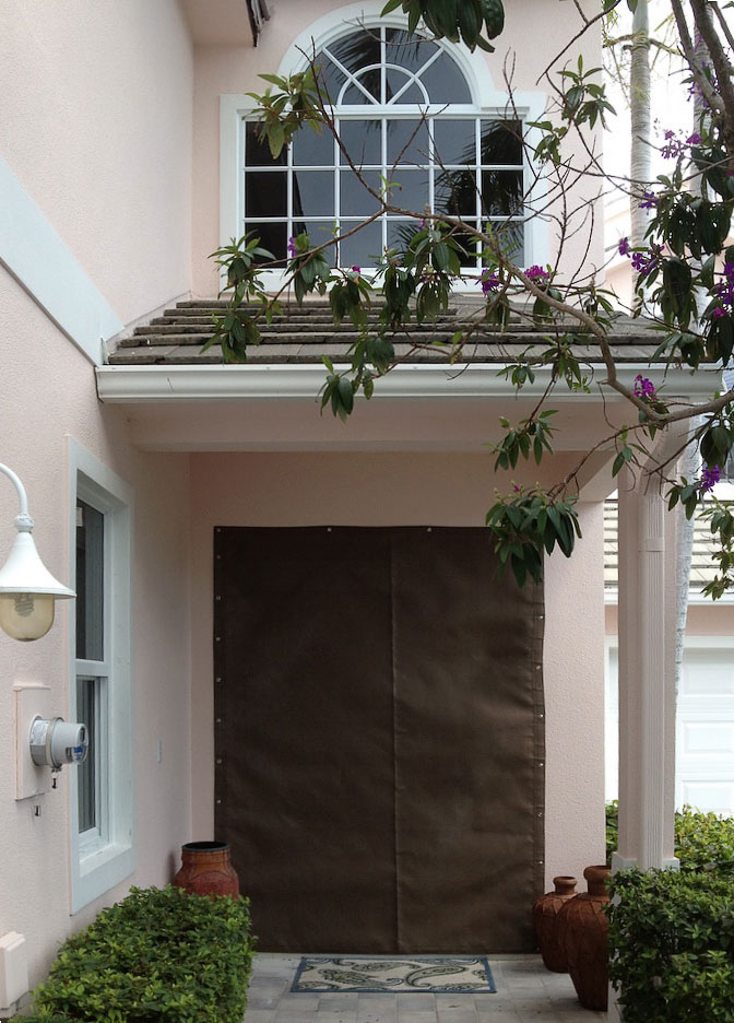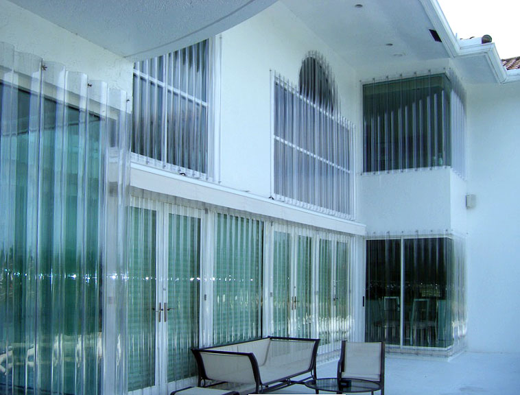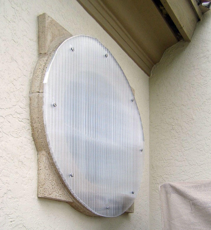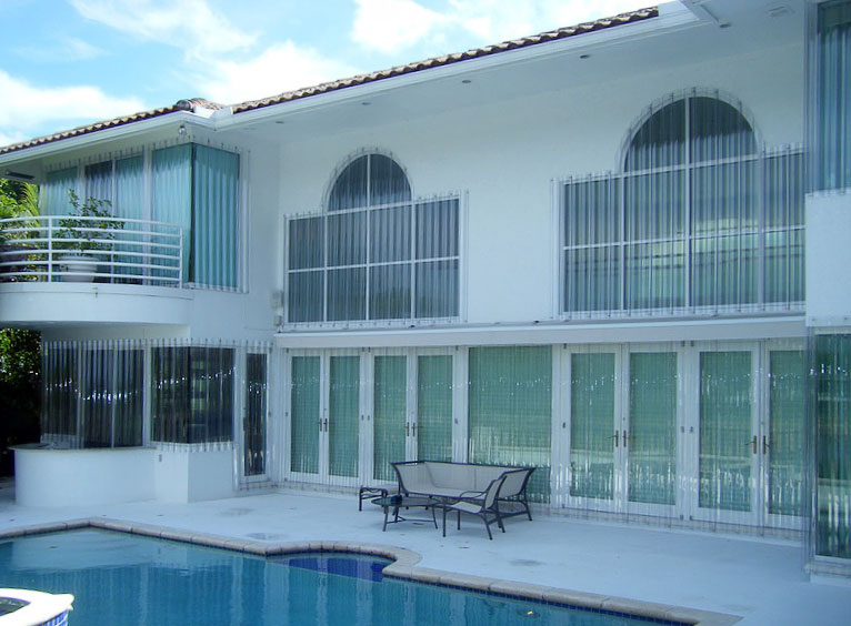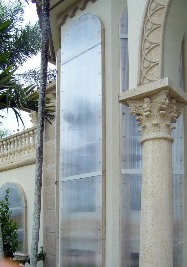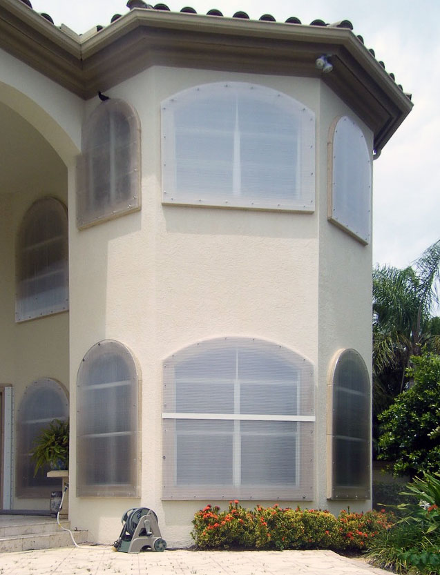 These are a relatively new alternative to one of the oldest protection devices, plywood sheets. Lightweight and strong, the panels are made from polycarbonate sheets cut to size for each opening, typically windows and doors. Flat panels are attractive because their architectural impact is also limited to the fastening system, which are usually small stainless steel anchors, which are easily capped to help minimize their appearance.
